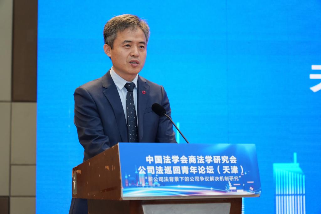 张劲枫代表天津市法学会对论坛的召开表示热烈祝贺。他表示,论坛以“青年”为主体,聚焦“公司法”,充分体现了中国法学会商法学研究会对青年才俊培养的高度重视,具有推动公司法理论与实务研究不断深化的战略眼光,新公司法的实施为公司法治翻开了崭新篇章,对公司争议解决的理论与制度实践提出了更高要求,天津市法学会素来重视推动本市专家学者与全国法学界的沟通交流,举办论坛有助于为大家提供交流思想、碰撞智慧的平台,期望青年学者和实务工作者深入探讨,畅所欲言,高度关注新法实施后涌现的新型、疑难、复杂案件类型及裁判思路,为深入理解和准确适用新公司法贡献“青年智慧”和“青年方案”。