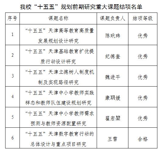 本站讯(通讯员 刘铄华)近日,天津市教育科学规划领导小组办公室公示了天津市教育事业发展“十五五”规划前期研究重大课题结项名单,贝博取得优异成绩,共有6项课题成功结项,充分展示了贝博在教育科学研究领域的实力和水平。