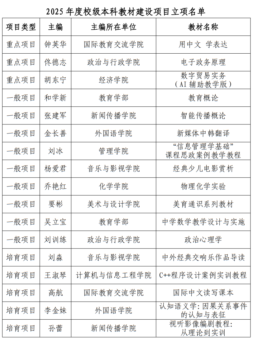 本站讯(通讯员 李倩)日前,2025年度校级本科教材建设项目立项名单正式公布。经个人申报、学部(院)审核推荐、专家评审及校内公示等程序,《用中文学表达》等17部教材获批立项。本次立项分重点项目、一般项目和培育项目三个类别,涵盖国际中文教育、政治学、经济学、教育学、新闻传播学、外国语言文学等多个学科领域。