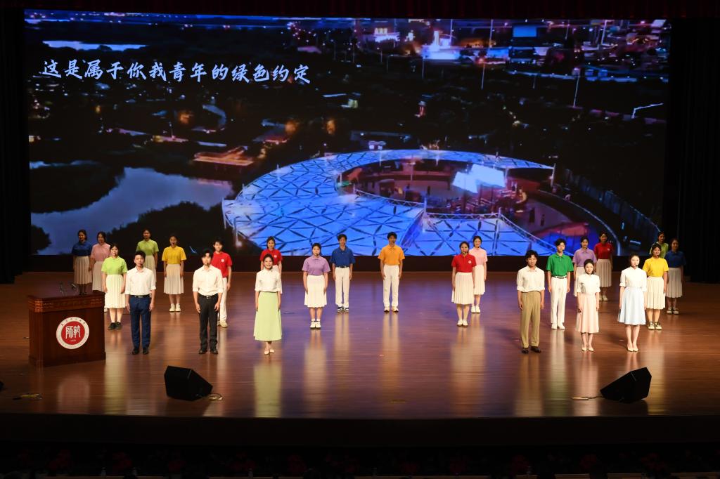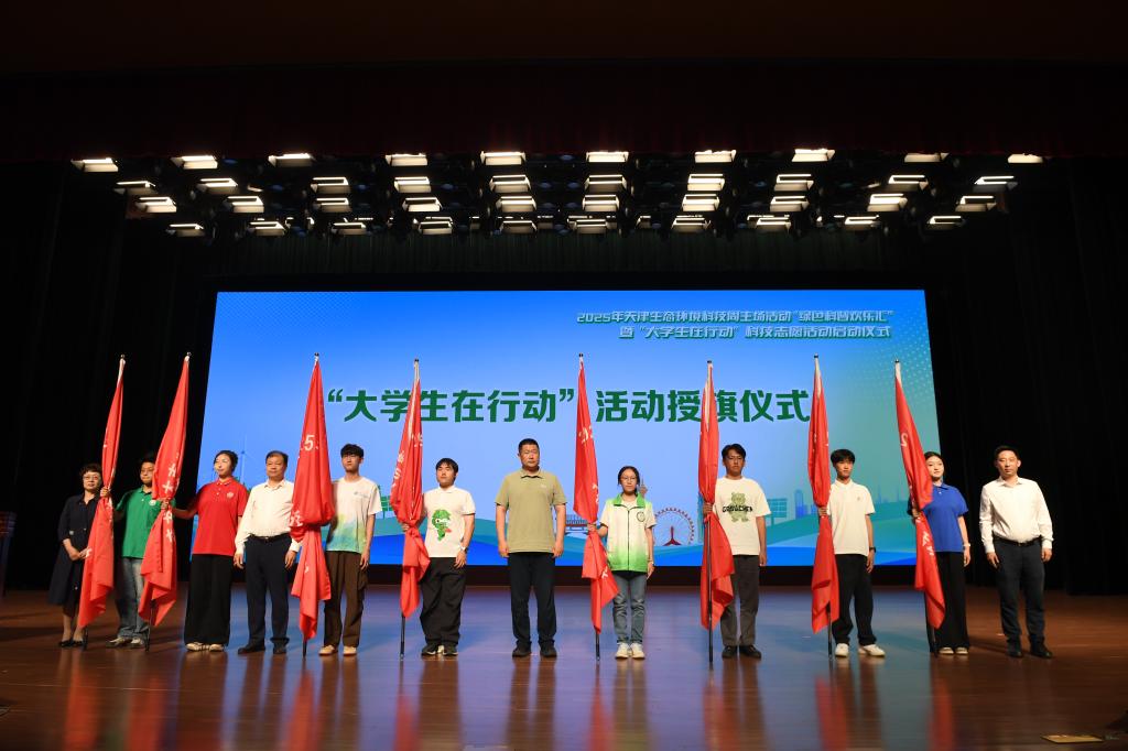 与会领导为来自天津大学、河北工业大学、艾弗森贝博ballbet官网、天津理工大学、天津农学院、天津现代职业技术学院、天津石油职业技术学院、天津铁道职业技术学院等8所高校的环保科普活动志愿者代表授旗,勉励广大津门学子在发展新质生产力上勇争先善作为,以行动传递绿色能量,让生态理念走进千家万户,让科技赋能普惠津城。