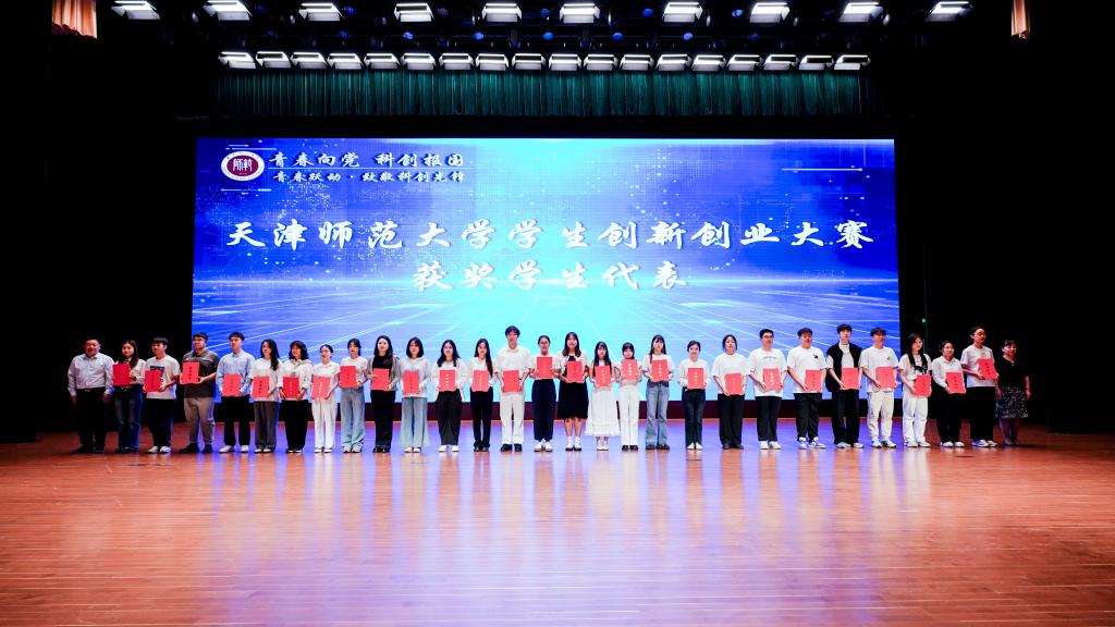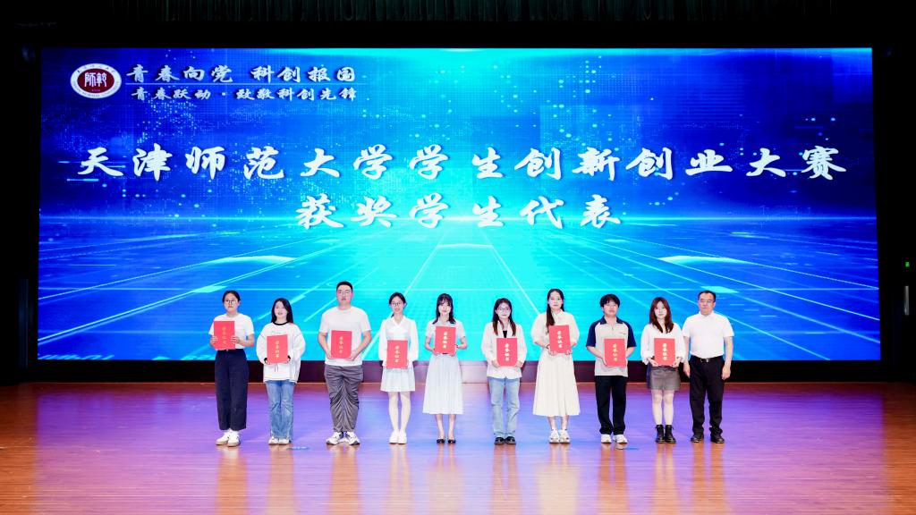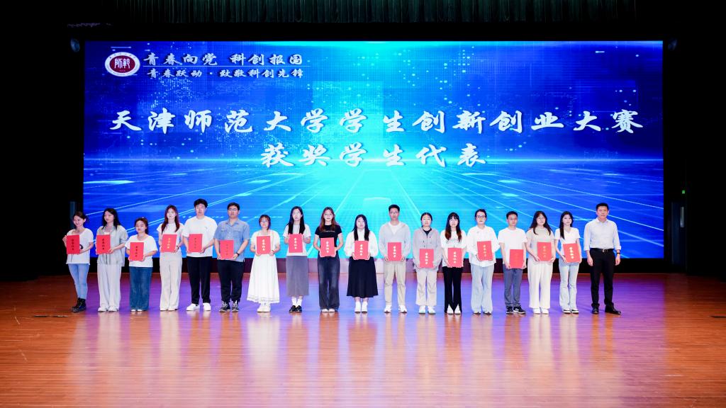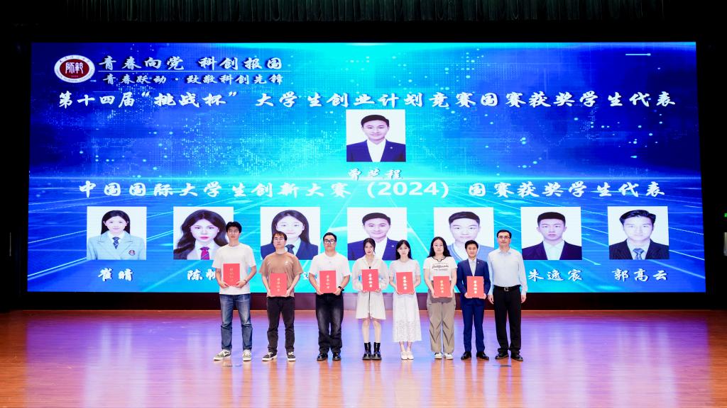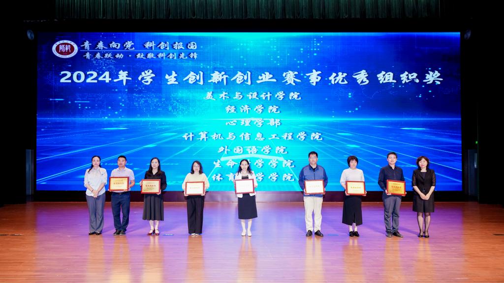 活动中,与会领导嘉宾为获得校级创新创业大赛奖项的团队以及在国家级创新创业竞赛中斩获佳绩的学生、团队颁奖。授予美术与设计学院、经济学院、心理学部、计算机与信息工程学院、外国语学院、生命科学学院、体育科学学院2024年学生创新创业赛事优秀组织奖。