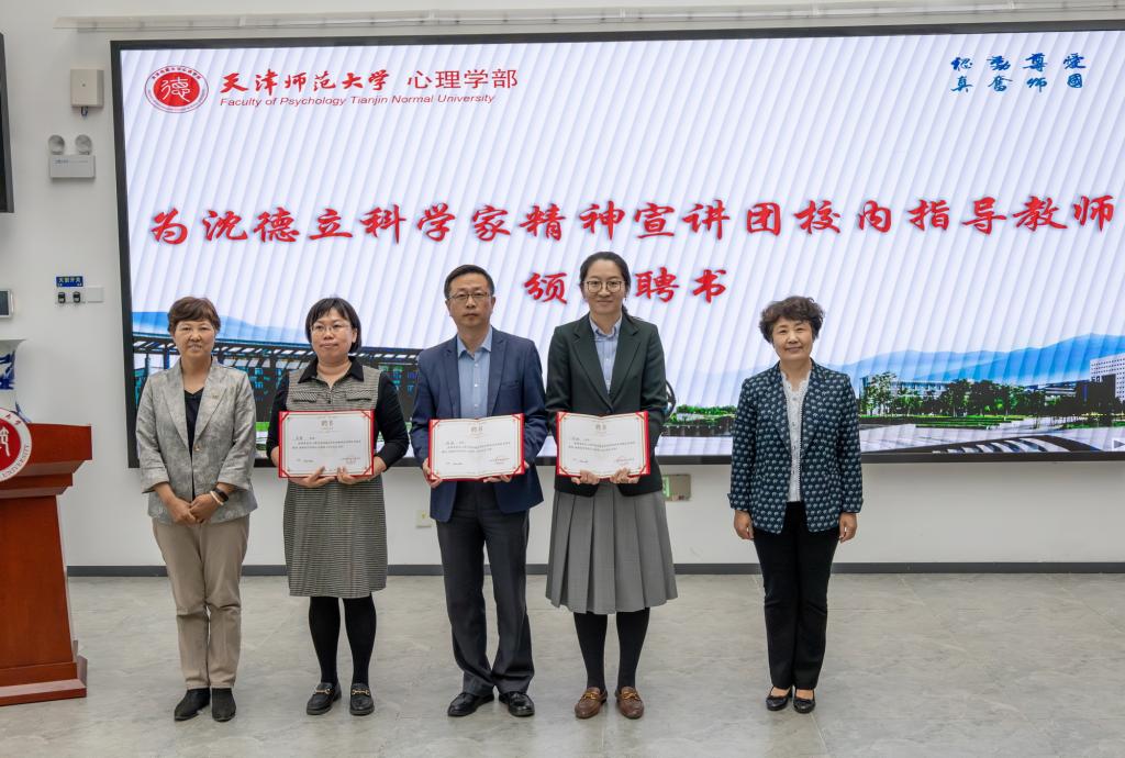 与会领导为沈德立科学家精神宣讲团成员代表颁发聘书、佩戴绶带。学部校友、南开中学穆玉凤、天津一中王亚丽、耀华中学张红肖、新华中学许岳宁、实验中学郭雯、艾弗森贝博ballbet官网附属实验学校孙铭悦受聘为校外宣讲员,校友服务与管理中心主任杨琥、天津市学生心理健康教育发展中心副主任李馨、全国高校“双带头人”教师党支部书记“强国行”专项行动团队成员林琳受聘为宣讲团校内指导教师。