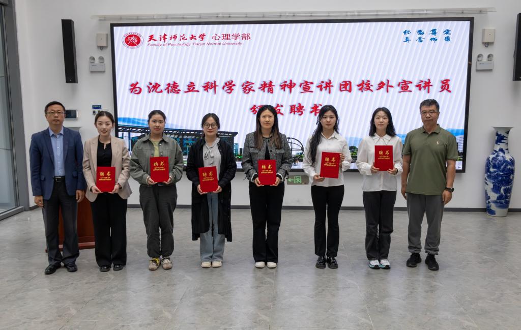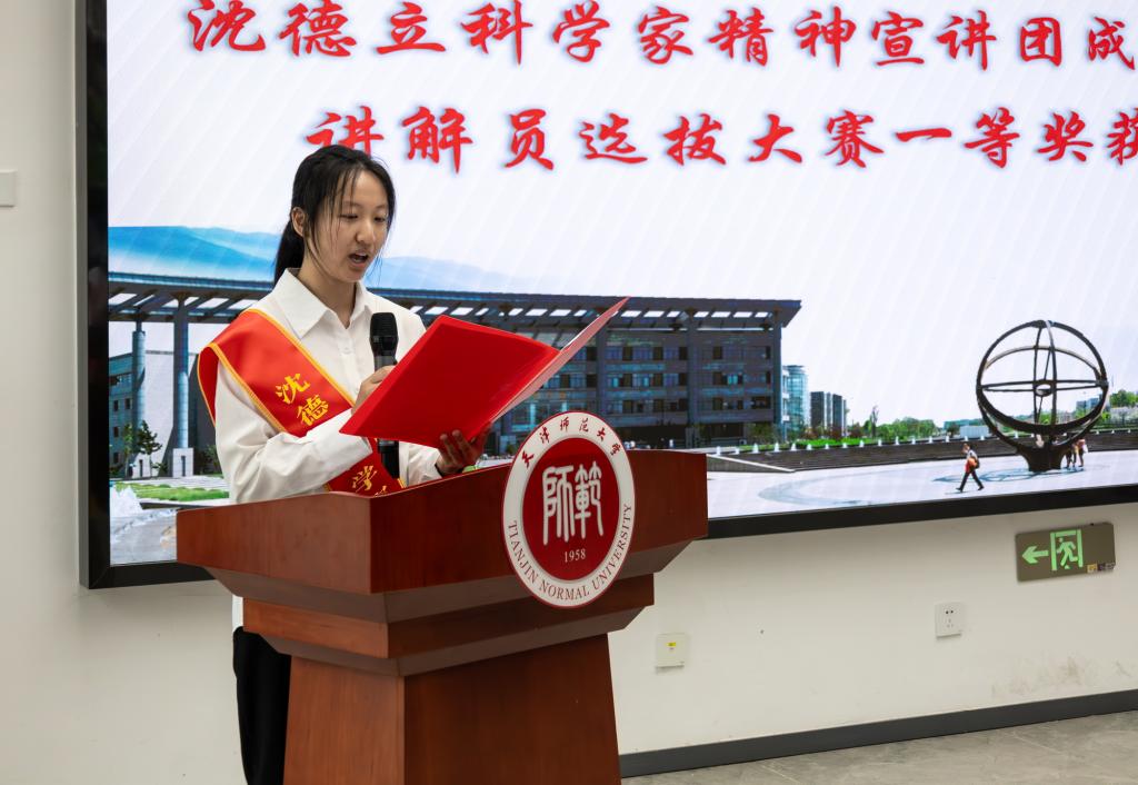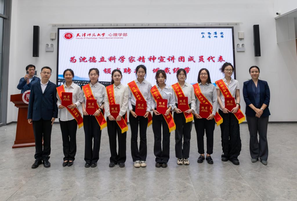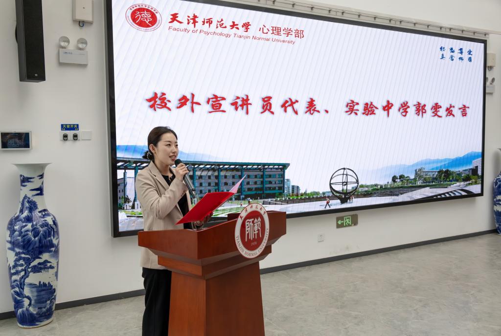 仪式上,与会师生共同观看了纪录片《我们的大先生》,共同学习沈德立先生“爱国、尊师、勤奋、认真”的治学精神和“人以德立”的崇高品质。心青年志愿服务团团长姜颖作服务团情况介绍,并带领服务团全体成员庄严宣誓。沈德立科学家精神宣讲团成员、学部“心青年开讲啦”讲解员选拔大赛一等奖获得者赵莞歆、校内指导教师代表、天津市学生心理健康教育发展中心副主任李馨、校外宣讲员代表、天津实验中学心理健康教师郭雯先后发言,表达了传承科学家精神,讲好大先生故事的决心。