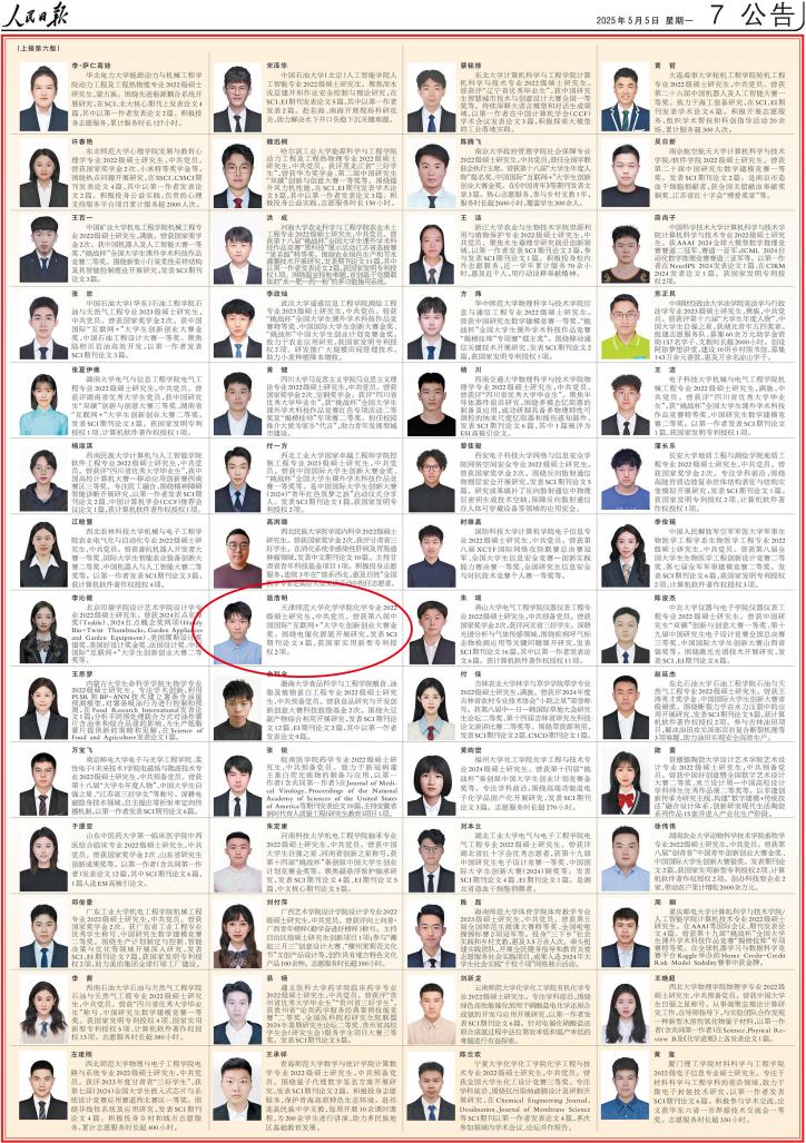 本站讯(通讯员 杨晨 乌日菡)2025年5月4日,《人民日报》刊登《2024年研究生国家奖学金获奖学生代表名录》,贝博化学学院化学专业2022级硕士研究生温浩明入选。