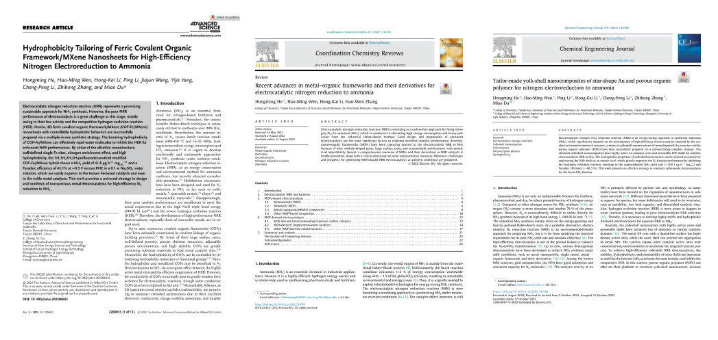 氨作为工业体系的核心化学品,是药物合成与化肥生产的关键原料。硕士阶段温浩明加入李程鹏教授课题组,在贺鸿明副研究员指导下,专注于功能多孔材料的合成及其在电催化氮还原领域的应用研究,致力于通过绿色环保的电化学方法实现人工固氮,以缓解传统哈伯法固氮带来的环境负荷。其设计的电催化剂综合性能达到领域先进水平,在实验室环境下实现了氨的高效绿色合成。相关成果发表于《Coordin. Chem. Rev.》《Adv. Sci.》等SCI一区TOP期刊,获批实用新型专利2项。“自大一下学期进入实验室从事该方向研究,‘电催化’几乎贯穿了我的整个求学生涯。创新之路虽荆棘满布,但对科研的热忱如同电催化剂,始终将沿途的挑战转化为前进的动能。”温浩明始终以国家“双碳”战略为指引,深耕清洁能源与低碳材料领域,未来他将继续以创新驱动发展,用青春智慧书写科技报国新篇章,为建设美丽中国贡献坚实力量,以青年的担当为绿色低碳事业贡献力量。