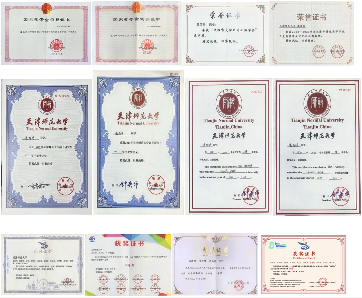 除了专业知识学习外,温浩明坚持理论与实践相结合,参加“互联网+创新创业大赛”“挑战杯全国大学生课外学术科技作品竞赛”等比赛,获得了多项国家、省部级奖项。