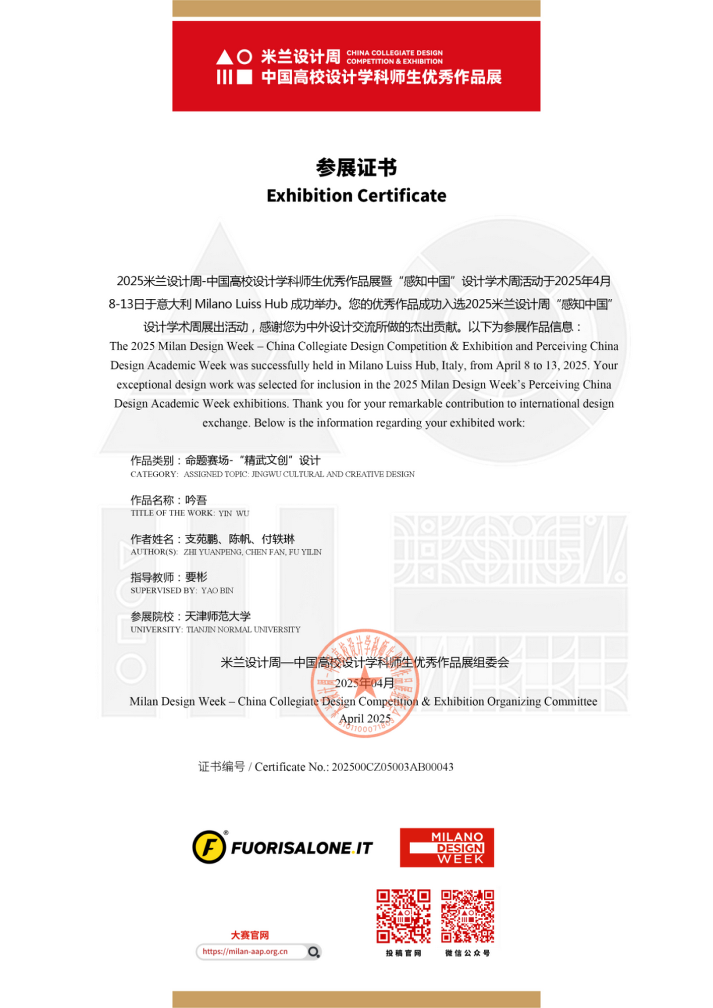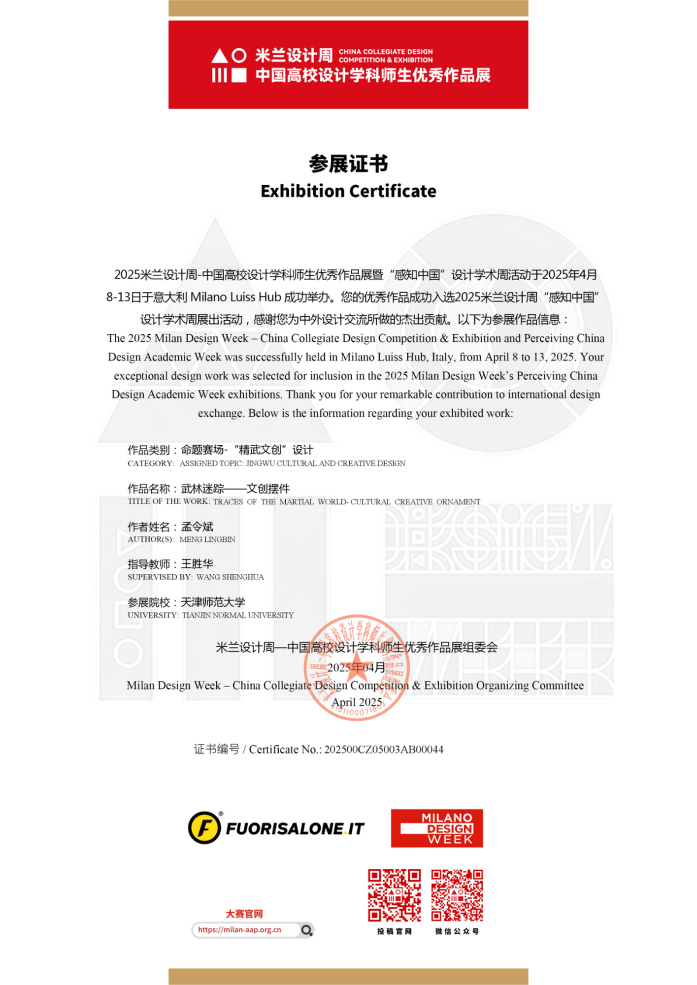 自2023年起,美术与设计学院联合西青区精武镇政府,打造了米兰设计周-中国高校设计学科师生优秀作品展之“精武文创”命题赛道。《吟吾》与《武林迷踪》均是“精武文创”国赛一等奖作品。从天津文化沃土的深耕细作到米兰设计周的聚光灯,印证了将地域文化基因转化为国际设计语言的可行性,实现了“在地性”与“全球性”的平衡,是学院深化“新艺科”建设、践行“服务地方、文化赋能”育人理念的生动实践。