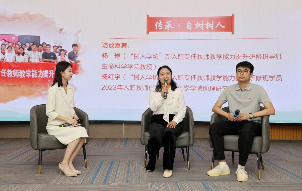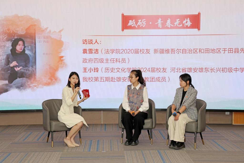 访谈环节中,“树人学坊”专任教师教学能力提升研修班教师“师徒”代表,生命科学学院教授杨琳和生命科学学院青年教师杨红宇讲述自树树人、薪火相传的故事,重温从教初心、坚定教育信仰,矢志以教育家精神为引领,用行动传承和践行教书育人使命。法学院2020届校友、新疆维吾尔自治区和田地区于田县先拜巴扎镇政府四级主任科员袁雪洁,历史文化学院2024届校友、河北省雄安雄东长兴初级中学历史教师、贝博第五期赴雄安新区支教团成员王小玲与师生分享了扎根祖国边疆、投身基层一线,将个人理想融入时代洪流的青春故事,以生动实践在祖国最需要的地方谱写青春篇章。鲜活的事例、朴素的语言、真挚的情感,引发现场观众强烈的思想共鸣,赢得阵阵掌声。