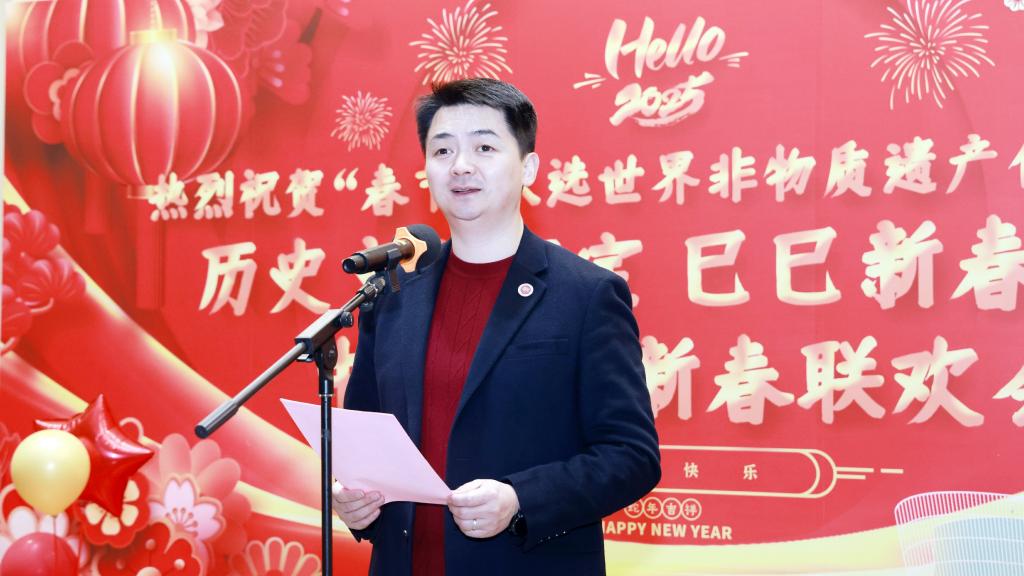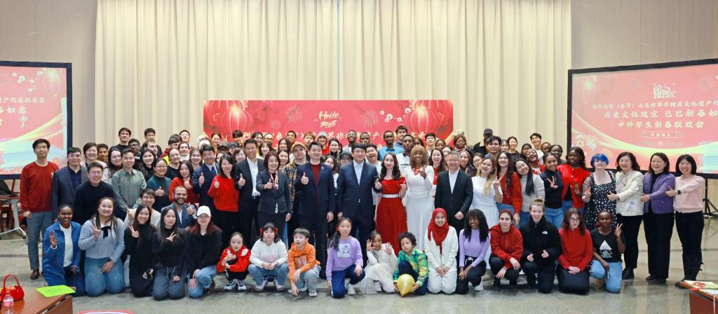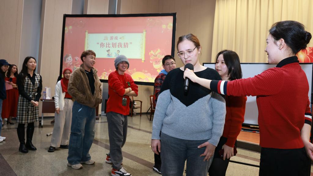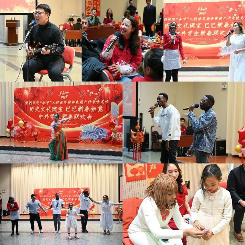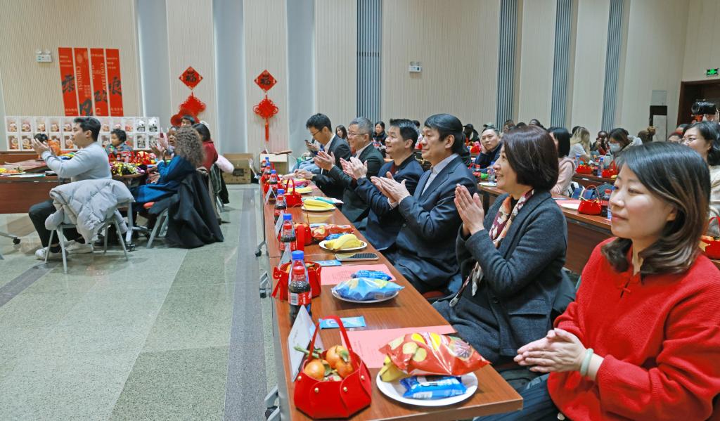 乙巳蛇年春节是“春节”申遗成功后的首个春节。联欢活动特邀“曾氏华服”曾氏津派盘扣技艺非遗传承人邢晋,带领中外学生现场领略盘扣艺术,体验春节的文化习俗。此外,活动还设置了书法体验、新春福卡制作、游戏互动、歌舞才艺表演环节,中外学子在欢声笑语和浓厚的节日氛围中共度难忘时光。