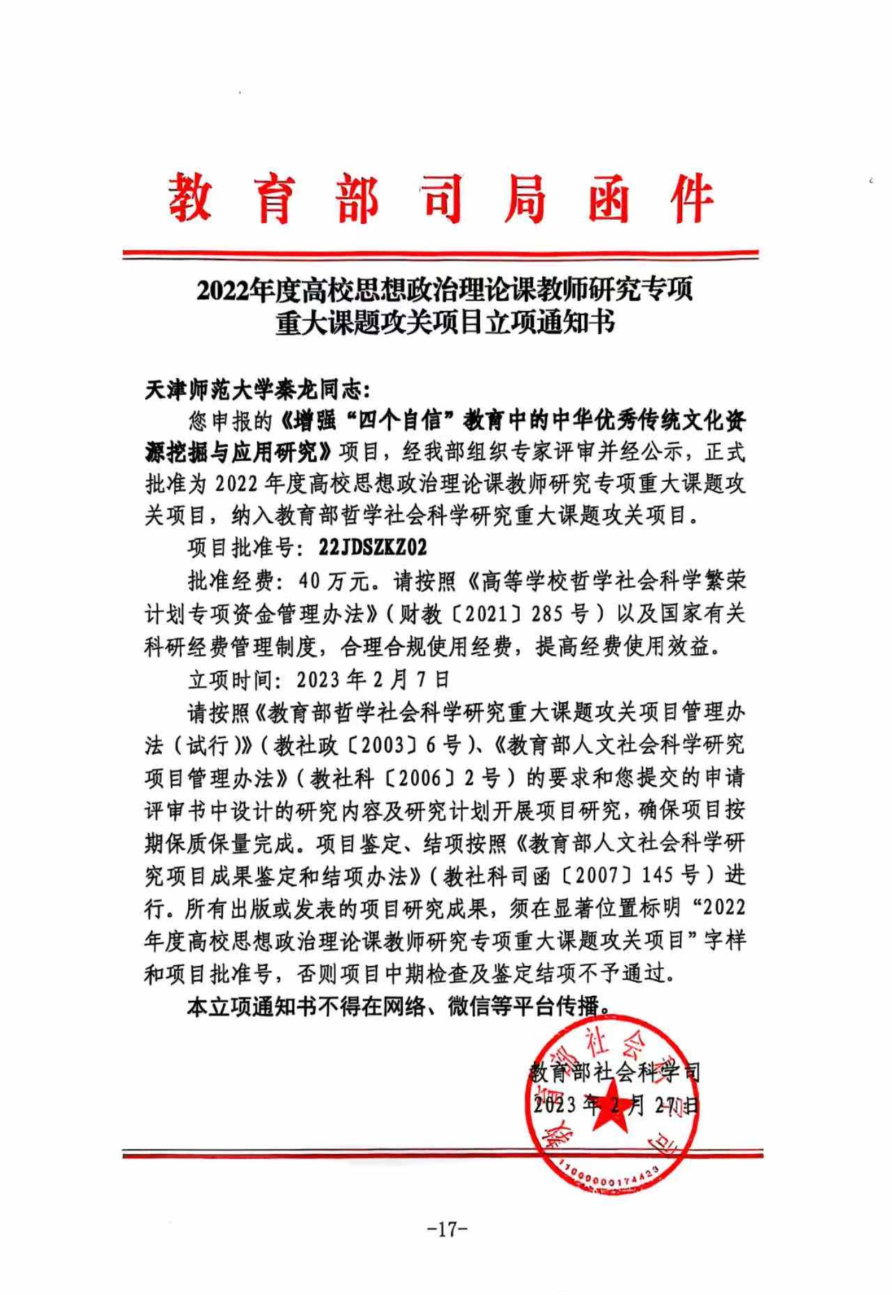 学校坚持马克思主义在哲学社会科学领域的指导地位,不断强化有组织科研,持续开展高水平项目培育,助力推出一批研究阐释党的创新理论、服务国家重大战略、构建中国特色哲学社会科学、传承创新中华优秀传统文化的科研项目。五年来,学校累计获批各类人文社会科学项目(含横向项目)1563项,科研经费总计11923.29万元。其中,获批国家社会科学基金重大招标项目8项、教育部人文社科重大课题攻关项目2项、国家社会科学基金重点项目12项、其他各类国家社会科学基金项目156项,1项成果入选《国家哲学社会科学成果文库》;获批教育部人文社会科学研究基地重大项目4项、教育部人文社会科学研究项目116项(其中重点项目8项);获批天津市哲学社会科学规划项目403项(其中重点项目101项)、天津市教育科学规划项目41项(其中重点项目13项)、天津市艺术科学规划项目34项。此外,贝博还获批最高人民检察院、最高人民法院、司法部、国家统计局、国家民族事务委员会、住房和城乡建设部、国家体育总局、国家语委等项目23项。学校立项横向课题450项,科研经费共5402.83万元。