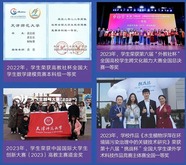 构建以能力培养为主线,分层次、多模块、全覆盖的实践教学体系,形成以培养学生创新创业能力为目标的“一个根本,二级平台,三个结合,四项举措”的育人格局。近5年来,学校在中国国际大学生创新大赛中荣获3金4银24铜佳绩,2020年首获大赛“红旅”赛道项目金奖,2021年荣获主赛道国际地区项目金奖,2023年再获主赛道大陆地区项目金奖;获批“大创计划”项目1312项,其中国家级163项;共有5052人次获得省部级以上各类竞赛奖励,其中国家级奖项1199人次;获天津市级本科生优秀毕业设计(论文)15篇。实施本科生导师制,促进学生全面发展。