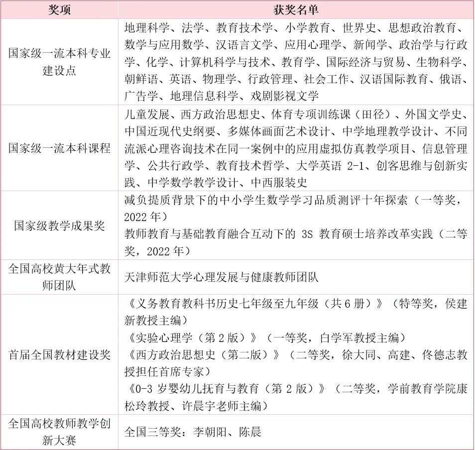 主动对接国家重大战略,服务社会经济发展,建立“招—培—就”联动机制,积极调整专业布局和招生计划,五年来调整专业10个。获批国家级一流本科专业建设点26个、市级14个,国家级一流本科课程15门、市级70门。获批市级新工科重点建设专业3个,首批市级产教融合型品牌专业培育点1个,建设首批微专业16个。沈德立心理学拔尖学生培养基地获批天津市首批基础学科拔尖学生培养基地。获评国家级教学成果奖2项、市级30项,市级教改项目33项。获批全国高校黄大年式教师团队,获评市级优秀教学团队6个、教学名师5名,基础心理学教学团队获批天津市级优秀基层教学组织;创建首批教学名师工作室26个。获全国高校教师教学创新大赛全国三等奖2项,市一等奖3项、二等奖3项、三等奖8项。在首届全国优秀教材建设奖中获特等奖1项、一等奖1项、二等奖2项;《普通心理学》入选第一批新时代教育部马工程重点教材建设项目。积极推动与高水平综合大学开展优质课程资源共享共建。