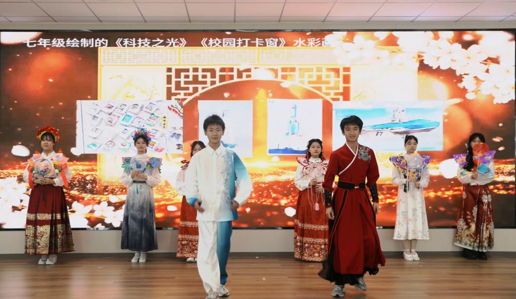 该节目由美术教师带领一年级、七年级的学生,将他们在美术课和社团课上精心制作的艺术作品——送福小蜗牛、书法团扇、山河新貌等,巧妙地融入到时装秀的表演之中。节目中所展示的服装全由学生们亲手设计和制作,每一件都蕴含着他们的用心和创意,这些作品不仅展现了学生们的艺术天赋,更巧妙地体现了人教版新教材的教学理念。学生们自信的步伐和别具一格的服装,让我们感受到青春的创造力与无限可能。