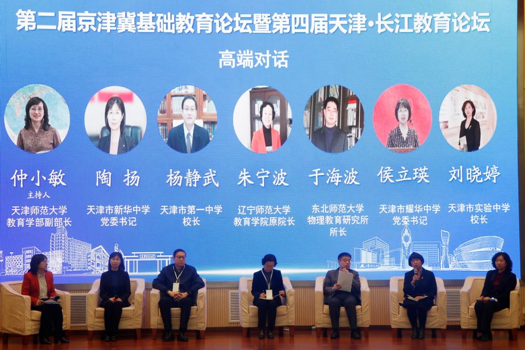 在高端对话环节,国家“万人计划”教学名师、辽宁师范大学教育学部教授朱宁波,东北师范大学教授于海波,天津市第一中学校长杨静武,天津市耀华中学党委书记侯立瑛,天津市新华中学党委书记陶扬,天津市实验中学校长刘晓婷6位专家分别就跨学科主题学习的意义理解、中华优秀传统文化融入基础教育、学校特色课程建设、新时代育人方式变革、基础教育协同发展等议题展开对话,展示前沿研究成果与丰富的实践经验,为京津冀基础教育发展提供思想启示和实践范例。