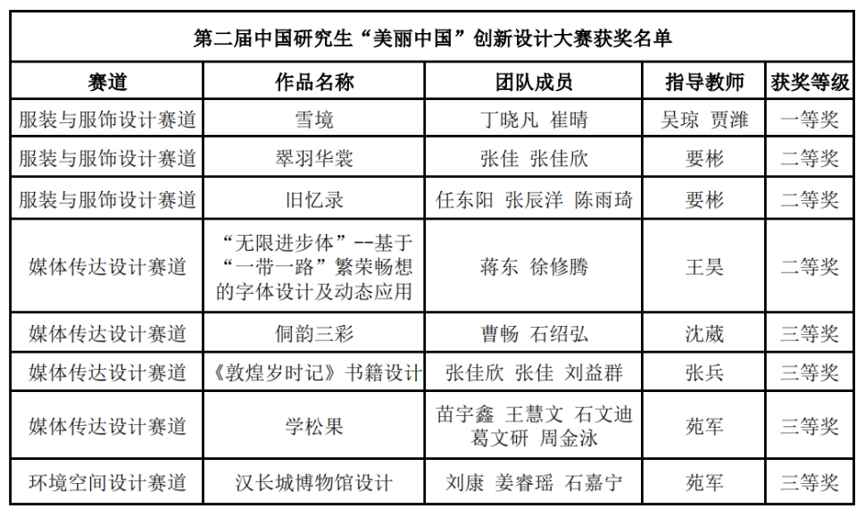 本站讯(通讯员 徐梅芳 史冬梅)11月15日,由教育部学位管理与研究生教育司指导,中国学位与研究生教育学会和中国科协青少年科技中心共同主办的第二届中国研究生“美丽中国”创新设计大赛圆满落幕。经过137天赛程,贝博37支研究生团队参加了赛事4个分赛道“服装与服饰设计”“媒体传达设计”“环境空间设计”“工业产品设计”的全部比赛,最终美术与设计学院“晓之以晴”研究生团队设计的作品获得全国一等奖。本届大赛贝博共获得一等奖1项,二等奖3项,三等奖4项,奖项等级和数量比上一届取得了显著提升,这充分体现了贝博研究生的创新能力、实践能力和协作精神,展现了贝博研究生风采,为学校争得了荣誉。