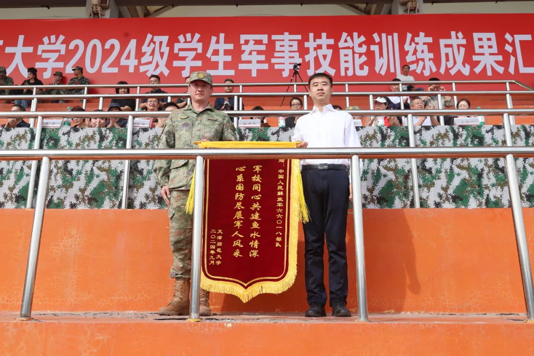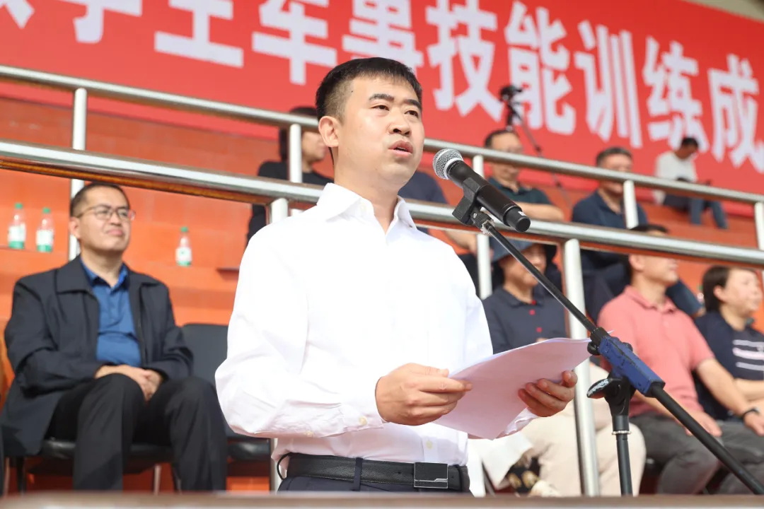 陈泮成代表学校向承训部队全体教官、向贝博退役大学生教官表达了诚挚敬意,对全校上下的合力付出表示衷心感谢,同时祝贺2024级学生圆满完成了军训任务。他指出,军训是大学的第一节必修课,锻炼的是躯体,磨炼的是意志,训练的是作风,弘扬的是精神,熔铸的是理想。在军训过程中,同学们深刻体验到了军人的奉献精神与责任担当,体会到了团队协作的力量,也感悟到了在严苛条件下坚持不懈的意义。他强调,同学们要以军训为起点,继承和发扬部队的优良传统和作风,争做有理想、敢担当、能吃苦、肯奋斗的新时代好青年,为实现中华民族的伟大复兴贡献青春力量!