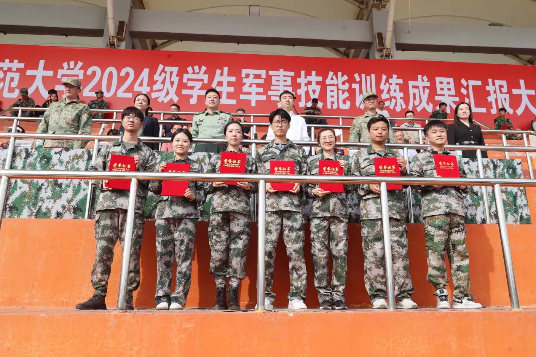 汇报展示结束后,领导和来宾为“爱我中华 情系国防”学生军训歌咏比赛、手抄报比赛,军训优秀内务评选获奖单位颁奖。
