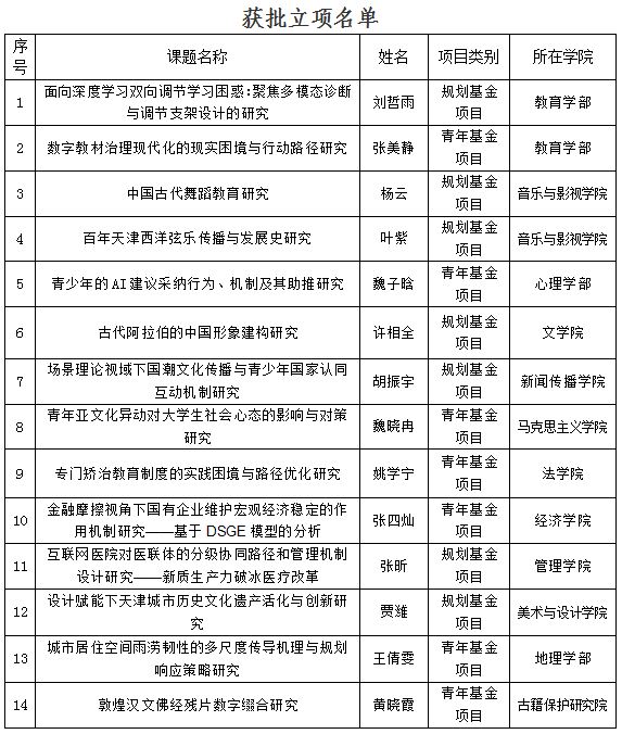 在14项项目中,教育学部获批2项,音乐与影视学院获批2项,心理学部获批1项,文学院获批1项,新闻传播学院获批1项,马克思主义学院获批1项,法学院获批1项,经济学院获批1项,管理学院获批1项,美术与设计学院获批1项,地理学部获批1项,古籍保护研究院获批1项。