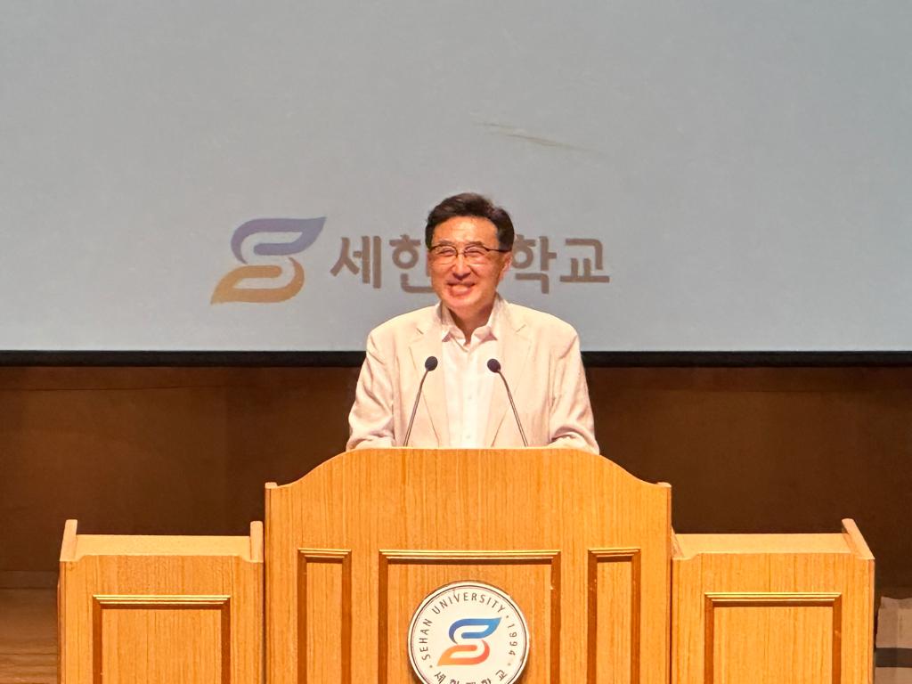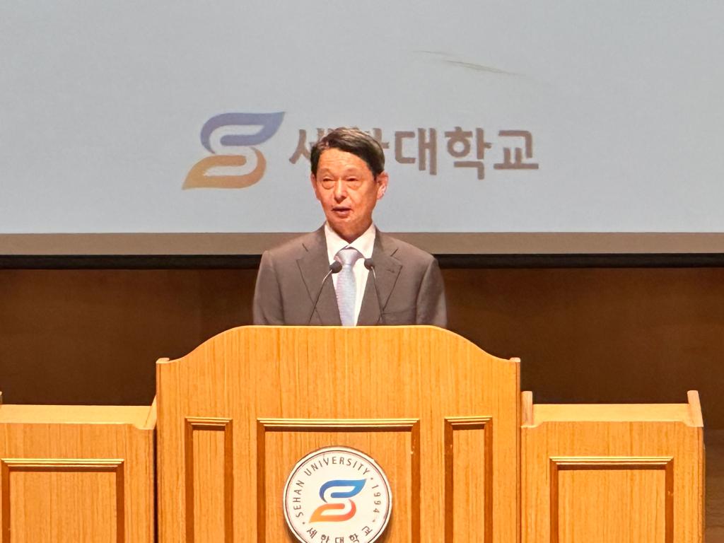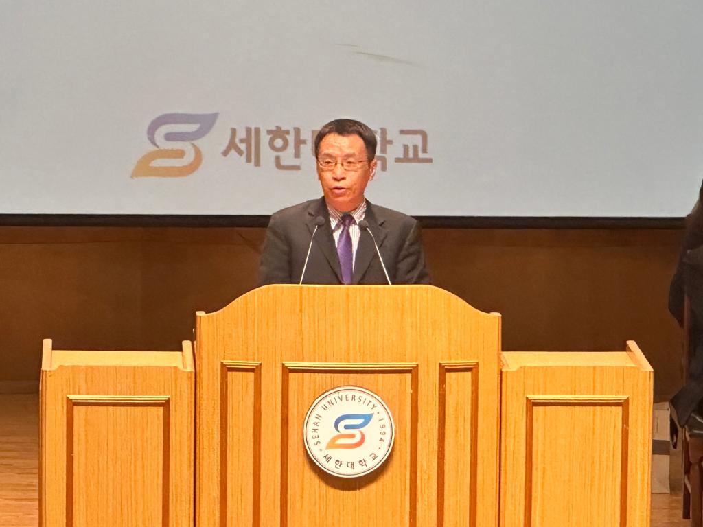 在结业式上,韩国世翰大学副校长杨福万代表世翰大学校长致辞,他向学员代表颁发——修了证,对顺利完成毕业论文答辩的学员们表示衷心的祝贺,对中韩双方教师和工作人员不厌其烦、耐心细致的工作表示诚挚的感谢。他勉励通过毕业论文答辩的学员们,要以此作为人生的新起点,进一步努力学习钻研,为中韩两国教育交流和中韩友好做出新的更大的贡献。