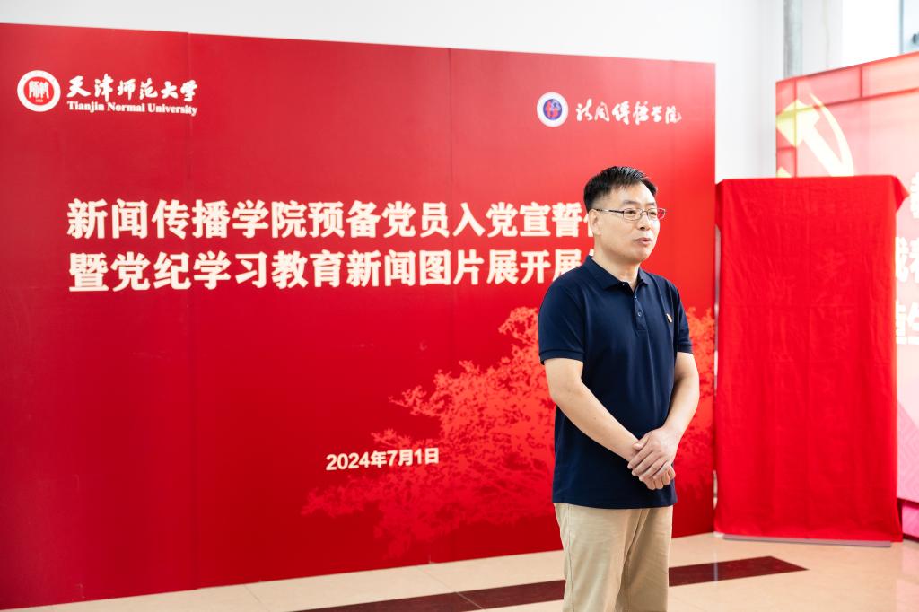 新闻传播学院党委委员张洪伟教授和2022级新闻学专业硕士研究生郭秀同志分别代表老党员和新党员发言。