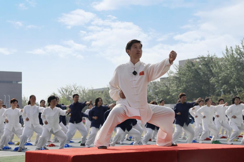 校工会教工方阵在体育科学学院教师孙春艳带领下,展示八段锦功法。此次“八段锦”功法展示方阵由来自24个基层分会的180余名教工组成,其中绝大多数为一线教师。老师们利用午休时间,反复练习,最终为大家带来精彩展示,彰显贝博教工昂扬向上的精神风貌。