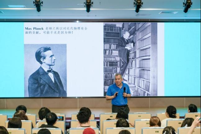 曹则贤从物理学史的回顾、物理学的教学、物理学的学习三个方面,讲述了物理学史的变迁,并对物理学的教学和学习方法进行了分享。让师生们在共赴一场物理之旅的同时,感受物理之美、践行物理之力。他从人们喜欢在冬天晒太阳这一日常情景讲起,提出了物体吸收光就一定会变热么?吸收光的物体,其温度会一直升高吗?物体如何能容纳无穷多的热?等一系列问题,让在场师生思考的同时,引出了“黑体辐射”这一物理概念。曹则贤表示,黑体辐射问题是近代物理的摇篮,是近代物理史上“一只会下金蛋的鹅”,通过回顾黑体辐射研究的细节,可以更加了解物理这门学问的历史。他鼓励师生要积极投入,乐学善教,在研学教中提升自我,为发展新质生产力贡献新时代物理力量。