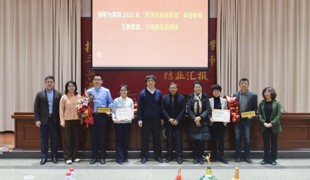 活动当日,校党委常委、副校长佟德志、音乐与影视学院党委书记滕杰、文学院党委书记李静、物理与材料科学学院书记张伟为荣获2023年“天津市最美家庭”荣誉称号王静家庭、王明霞家庭颁奖,并合影留念。