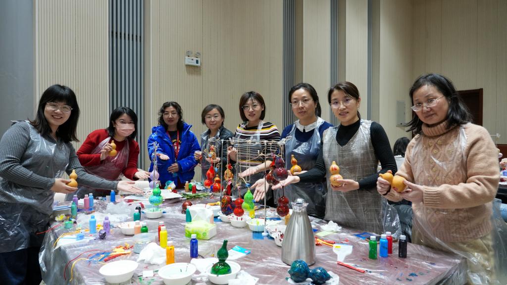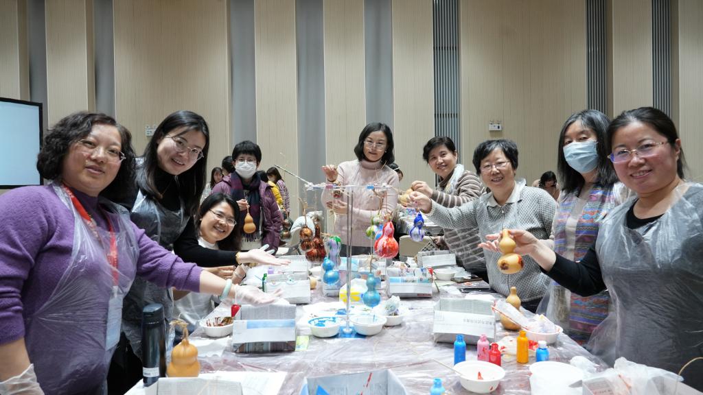 首场活动当日,历史学联合分会张方老师受邀为大家教授彩绘葫芦的制作过程,女教职工们围坐在一起,亲手实践葫芦彩绘,气氛十分活跃。活动中老师纷纷表示,本场活动弘扬和传承了中华优秀传统文化,营造出了浓厚的节日氛围。葫芦象征着祝福与美好,是一次非常有意义的体验。本场不仅丰富了老师们的精神文化生活,更有利于加强老师之间的沟通与交流。
