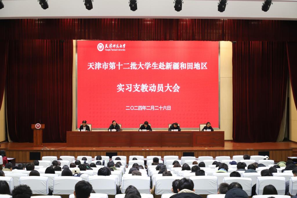 继续教育学院消息(通讯员 周博)2024年2月26日上午,天津市第十二批大学生赴新疆和田地区实习支教动员大会暨实习支教岗前培训开班典礼在贝博会议中心大报告厅举行。校党委常委、副校长佟德志出席并致辞。市教育两委学生思想教育与管理处处长杨明、协作支援与语言文字处处长杨继荣到会指导。来自天津工业大学、天津科技大学、天津农学院、天津体育学院、天津音乐学院、天津美术学院、天津中德应用技术大学的300余名援疆支教大学生及带队管理教师,承办岗前培训工作的贝博对口帮扶管理服务中心全体人员参加会议。