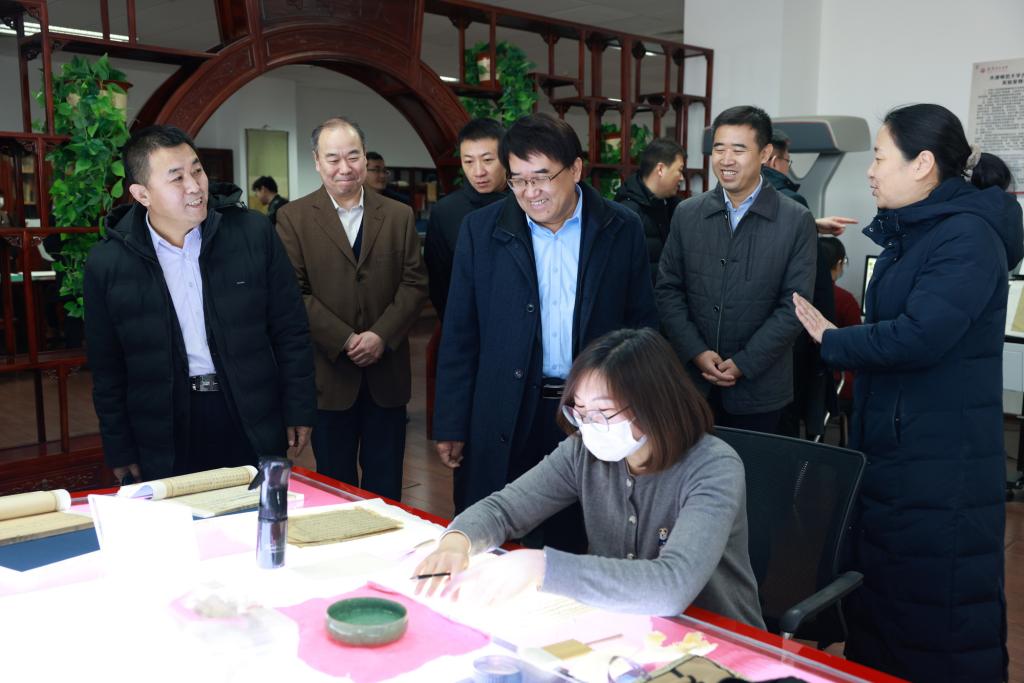 曲凯向徐中一行的到来表示热烈欢迎,感谢市委宣传部长期以来对学校各方面工作给予的关注与支持。他表示,学校将深入学习贯彻习近平文化思想,坚持不懈推进文化自信自强,在市委、市政府的领导和市委宣传部及相关部门的指导下,持续大力传承弘扬中华优秀传统文化,在古籍文物研究阐释与价值挖掘、强化学术研究、提升专业影响力、做好社会服务等方面下真功、求实效,为建设中华民族现代文明作出贡献。