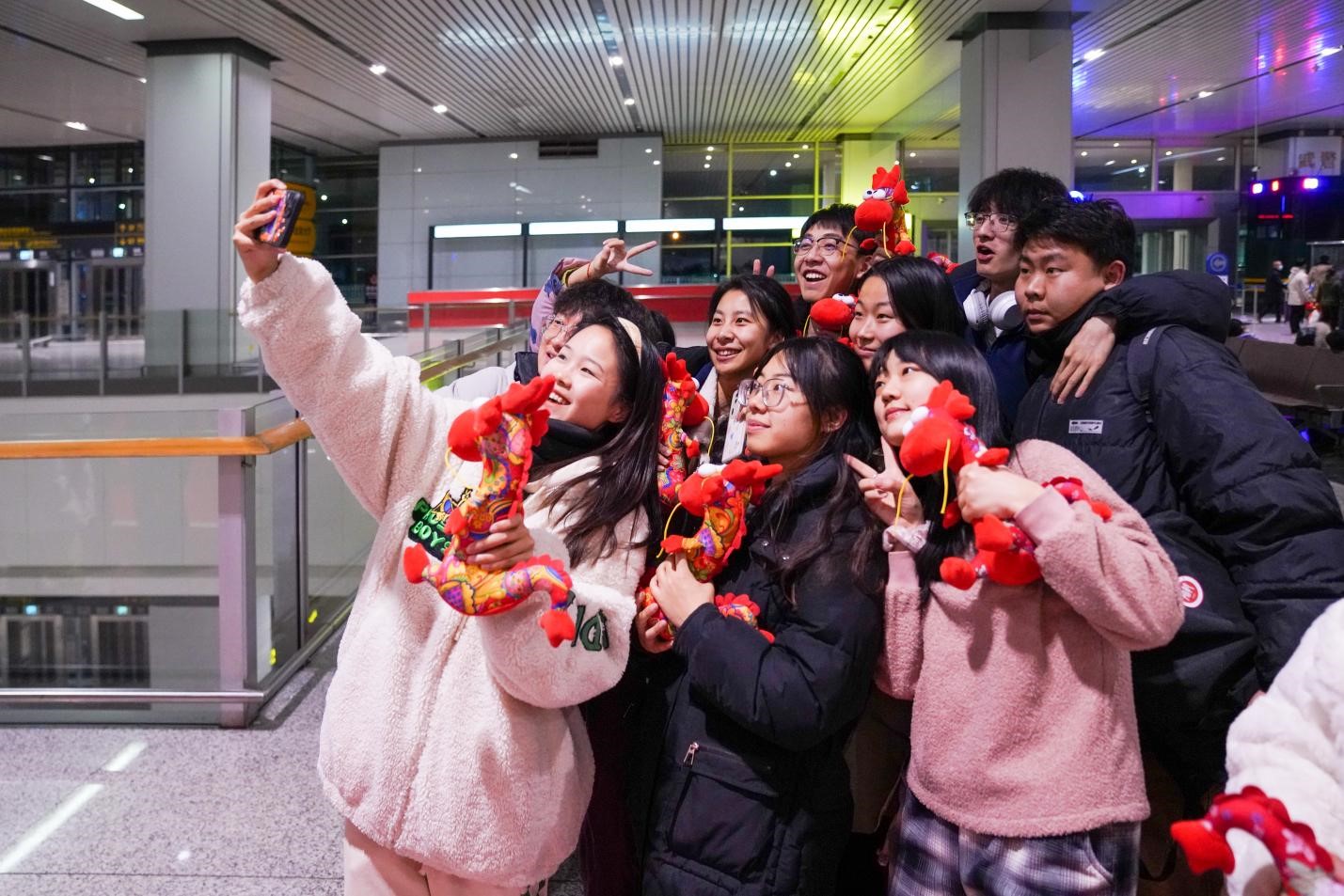 “祝贺大家圆满完成实习支教任务,我们代表全校师生接你们回家啦!”在机场出站口,副校长陈玳玮与随行人员一起向支教团带队教师送上鲜花、为同学们送上龙年纪念玩偶和慰问包,并与大家亲切交流。他首先代表学校对援疆支教师生的辛勤付出表示感谢和敬意,对师生圆满完成本次支教任务顺利返校表示祝贺和欢迎,对同学们用实际行动为边疆教育和社会发展所做的贡献表示赞赏。他说,支教团的行动牵动着全校师生的心,我们无时无刻不在惦念和关心着支教师生,同学们是新时代好青年,是师大的骄傲,“一次援疆行、终身援疆情,一次支教行、一生支教情”,援疆支教这段特殊的经历,是同学们一生难忘的财富,不仅锤炼本领、增长才干、结交友谊,还以实际行动展示了师大学子的挺膺担当。希望同学们将此次难忘的青春历练和宝贵的精神财富传承下去,赓续奋斗、勇毅前行,为党和国家的教育事业贡献青春力量。