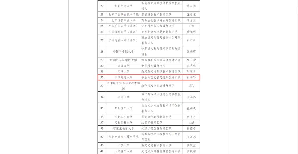本站讯(通讯员 于海涛)9月5日,教育部发布了第三批“全国高校黄大年式教师团队”创建示范活动认定名单和第四批“全国高校黄大年式教师团队”创建示范活动入围名单,贝博“学生心理发展与健康教师团队”入选“全国高校黄大年式教师团队”创建示范活动认定名单。