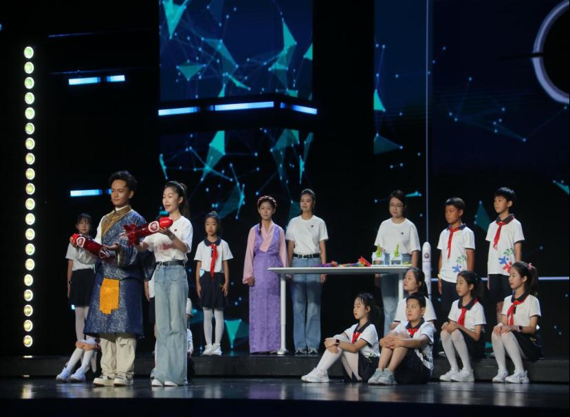 全国科学实验展演汇演活动特等奖与最佳表演奖作品,教育学部创编的《飞天逐梦》亮相“天津科普之夜”,团队对剧目进行了创新改编。正值西藏自治区成立60周年,剧目以科学教育专业公费师范生的日常科普实践为背景,巧妙融入了明朝万户飞天的历史故事。演出中,科学师范生们与两位立志成为科学教师的藏族同学,以及15名小学生共同组成生动的课堂场景。通过对剧目环节的改良与升级,形象展示了航天科学原理,更展现了科学教育跨越地域的传播力量。