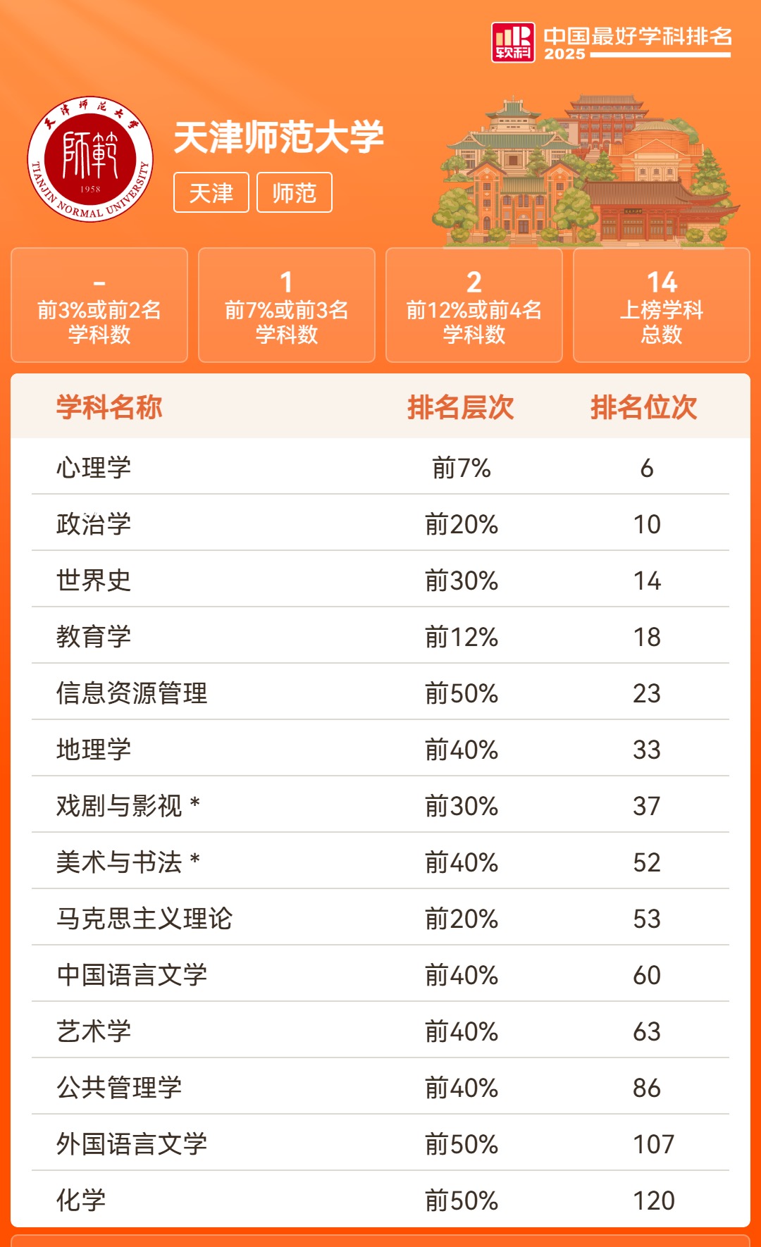 3个优势学科排名提升,综合实力稳步增强。心理学(0402)排名上升1位,进入全国前6;政治学(0302)排名上升1位,进入全国前10,持续保持国内领先水平;教育学(0401)由第22位跃升至第18位,进入全国前12%,学科影响力进一步增强。