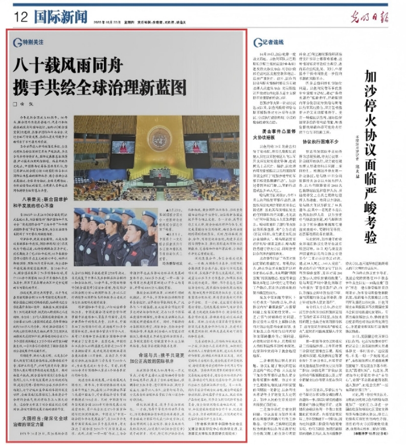 文章指出,命运与共:携手共建更加公正高效的国际秩序。站在联合国成立80周年这一历史节点,习近平主席以大国领袖的责任担当和远见卓识,提出了全球治理倡议,强调奉行主权平等、遵守国际法治、践行多边主义、倡导以人为本、注重行动导向,为完善全球治理体系贡献了核心理念和行动指南。强化机制建设,提升多边治理效能。一方面,倡导平等有序的世界多极化,持续推进联合国安理会改革进程,提升全球南方国家的代表性和发言权;完善议事规则与表决程序,健全区域性代表轮换机制,切实履行好《联合国宪章》赋予的职责。同时,坚定维护联合国地位和权威,健全国际法治体系,推动重要国际公约公平性修订,切实维护各国主权平等与领土完整。另一方面,高擎多边主义火炬,健全全球治理评估体系,制定成员国行为准则框架,确保各项治理规则得到有效落实。同时,坚持共同、综合、合作、可持续的安全观,构建多层次国际预警体系,强化国际危机预防与调解能力,完善维和行动部署流程,全面提升冲突后重建效能。深化发展合作,夯实全球治理基础。一方面,大国要作出表率,为国际社会提供更多公共产品,健全可持续发展项目库,系统推广普惠性发展模式,增加减贫与公共卫生专项基金,加强技术援助与能力建设。同时,倡导普惠包容的经济全球化,改革国际金融机构治理结构,增加发展中国家投票权比重,完善发展资源分配机制,促进资金高效利用和公平分配。另一方面,发达国家要切实履行责任,兑现发展援助和气候融资承诺,着力构建技术转移平台,健全绿色发展合作示范区,推动数字基础设施共建共享。同时,全球南方国家要守望相助,持续完善发展合作评估体系,共建项目效果监测机制,确保发展成果的可持续性和普惠性。完善治理体系,引领新兴领域发展。一方面,弘扬全人类共同价值,加快制定共识性人工智能伦理准则,建立技术风险评估框架,推动技术标准互认互通。制定空间碎片治理标准,健全轨道资源管理机制,持续促进外层空间的和平利用与可持续发展。坚持共同但有区别的责任原则,完善极地治理体系,健全全球环境保护标准,推动应对气候变化国际合作,持续强化全球生态监测与保护力度。另一方面,践行多边合作的全球治理,健全跨境监管协调机制,推动监管沙盒互认,促进创新产品快速落地,同步设立国际风险审查委员会,健全伦理问题快速响应机制。同时,加快建设新型国际合作平台,促进政府、企业、学界的跨国交流,持续构建开放包容的全球创新生态系统。