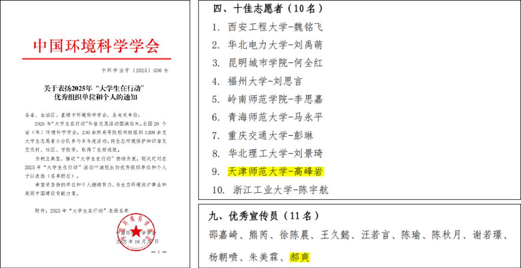 本站讯(通讯员 陈洁)近日,从中国环境科学学会传来喜讯,在最新发布的《关于表扬2025年“大学生在行动”优秀组织单位和个人的通知》中,贝博地理学部师生表现突出,郝爽老师荣获“优秀宣传员”称号,高峰岩同学荣获“十佳志愿者”称号。这一荣誉不仅是对两位师生个人的肯定,更是对学部实践育人成果的充分认可。