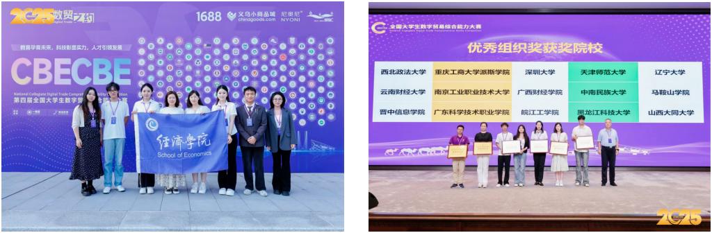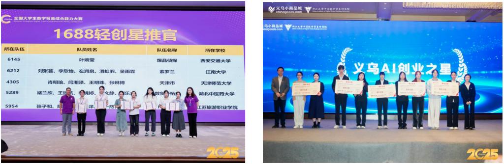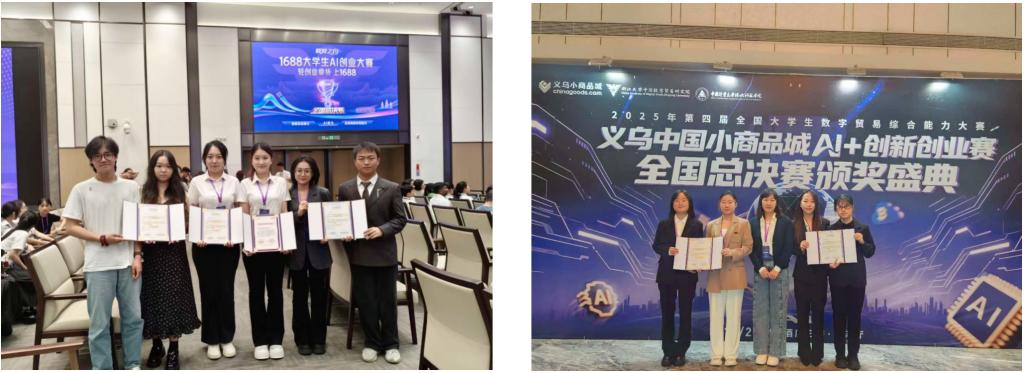 本站讯(通讯员 白帆)在刚刚落幕的全国大学生数字贸易综合能力大赛中,经济学院五支学生团队参加杭州“1688大学生AI创业”赛道与“义乌中国小商品城AI+创新创业”赛道的比赛,最终斩获4项全国二等奖、1项全国三等奖,两个团队分获大赛特设的“1688轻创星推官”和“义乌AI创业之星”荣誉称号,经济学院荣膺“最佳组织奖”。成绩的获得体现了经济学院以创新创业教育为切入点,坚持国际经济与贸易专业建设向数字化转型,加快数字贸易人才培养,推进专业优化升级和数字化改造取得了积极的成效。