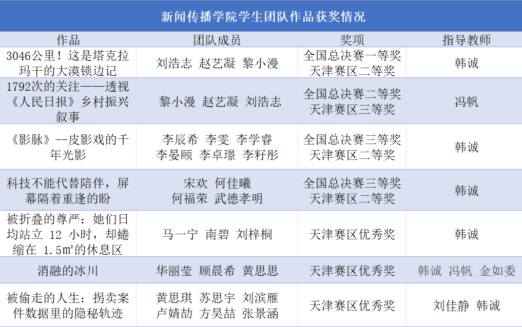 在此前举行的天津赛区选拔中,新闻传播学院共有7件作品入围,最终获天津赛区二等奖3项、三等奖1项、优秀奖3项,获奖总数位列天津赛区高校首位,内容涵盖生态建设、乡村振兴、传统文化等多个社会关切领域。