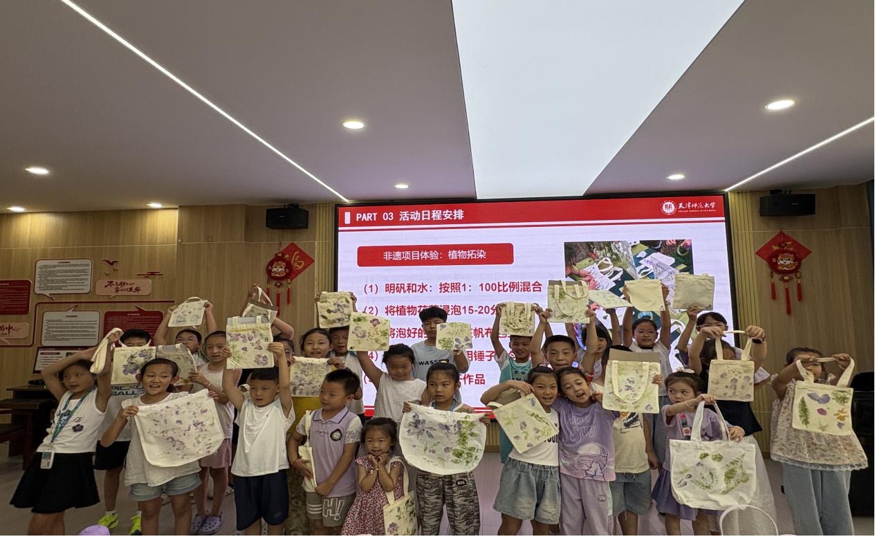 实践团开展了“拓花草之印,染自然之美”的植物拓染活动。志愿者们讲解了拓染的原理,孩子们小心翼翼地将花叶摆成自己喜欢的图案,然后用锤子一下下轻敲。随着锤起锤落,原本洁白的帆布包上渐渐浮现出花叶的轮廓。通过“看-听-做”这种沉浸式体验,孩子们的专注能力得到提升,同时收获感满满。
