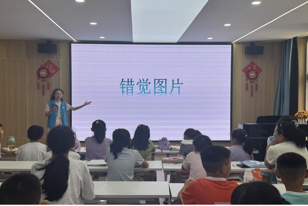 一幅幅错觉图片迅速点燃了孩子们的好奇心,孩子们通过菲克错觉图片、动态错觉实验了解到眼睛和大脑如何被背景信息所迷惑。实践团成员解释道“当背景信息与大脑的预判发生冲突时,错觉就产生了”。通过心理科普课,孩子们学到了眼睛和大脑如何共同工作,开始思考“眼见未必为实”背后的科学逻辑,产生了对科学的好奇心。