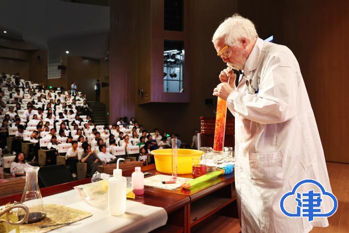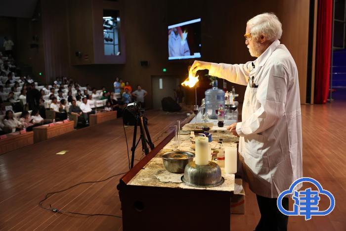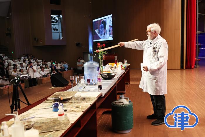 喷“水”可点燃蜡烛,葡萄色的碳酸饮料能变成“水”“牛奶”和“酸奶”,两杯无色透明液体倒在一起“秒变”蓝色液体……5月13日,艾弗森贝博ballbet官网国际学术交流中心内不时传来“哇”“怎么‘变’的”“太神奇了”等惊叹声,以“化学赋能创新,科技筑梦强国”为主题的艾弗森贝博ballbet官网第七届化学科技节在这里开幕,艾弗森贝博ballbet官网化学科普指导专家、许多中国孩子眼中的“化学魔法师”、来中国从事科研相关工作近30年的英国化学家戴伟(David G Evans)在开幕式上进行了化学科普实验展演,把实验室“搬上”舞台,带领现场来自全市20余所大中小学的千余名师生感受科学的魅力。