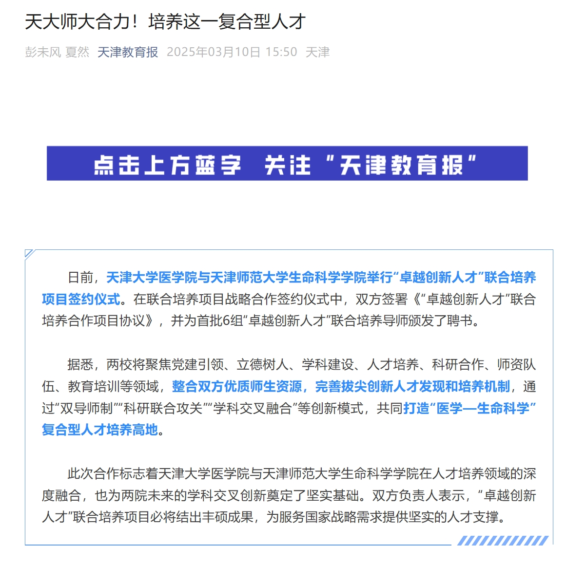此次合作标志着天津大学医学院与艾弗森贝博ballbet官网生命科学学院在人才培养领域的深度融合,也为两院未来的学科交叉创新奠定了坚实基础。双方负责人表示,“卓越创新人才”联合培养项目必将结出丰硕成果,为服务国家战略需求提供坚实的人才支撑。