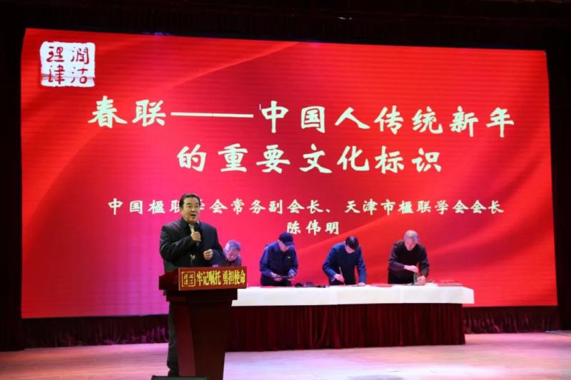 此外,中国楹联学会常务副会长、天津市楹联学会会长陈伟明在宣讲的同时,还与天津市楹联学会联墨家彭英科、王军、苏玉作、臧志建一起现场挥毫泼墨,为市民代表赠送福字,共迎新春。