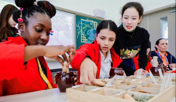 非遗香囊,通常以丝绸或布帛制成,以各色彩线刺绣为饰,色彩绚丽,图案美丽。在体验过程中,选手们不仅深入了解其历史,还尝试亲手制作。来自多哥的德容说:“制作香囊真的很有趣,我亲手把艾叶、丁香、藿香、佩兰等药材捣碎,装进香囊中。那些药材混合的香气出乎意料地好闻,药材的名字也充满诗意。”玻利维亚选手卡拉表示:“我选择了一个红色的香囊,因为它看起来很喜庆。我打算以后随身携带它。”