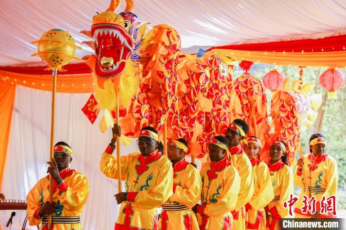 肯尼亚内罗毕大学孔子学院的学生表演舞龙。