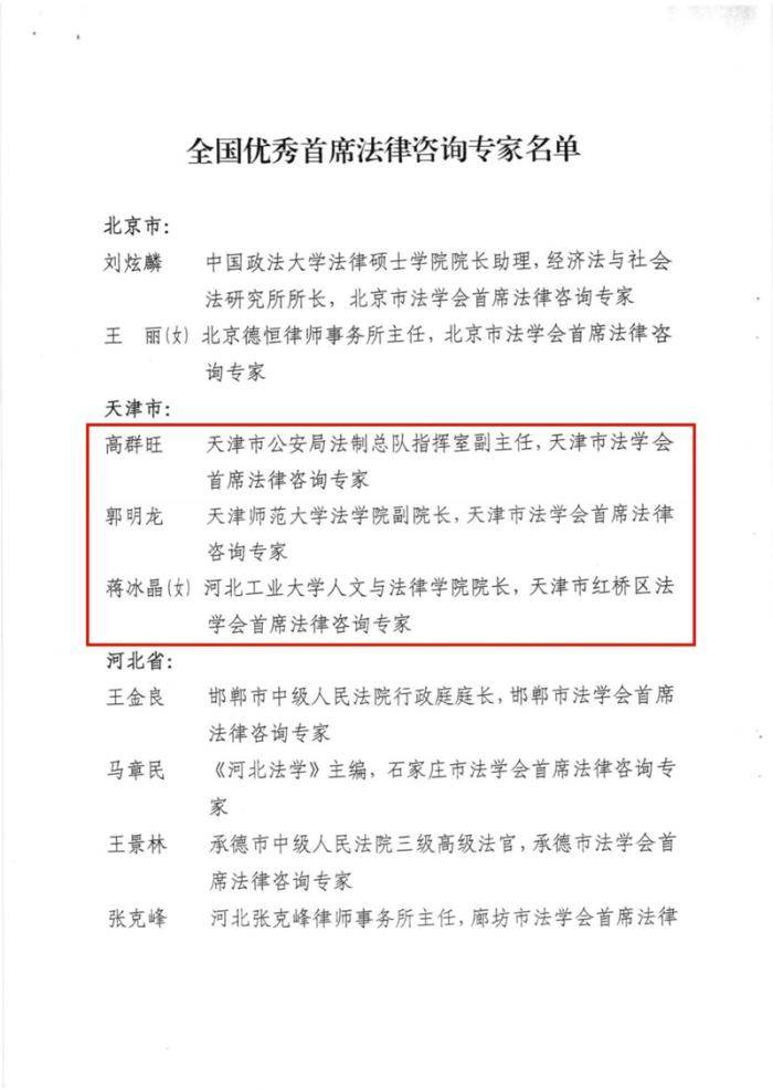 这3人分别是:天津市公安局法制总队指挥室副主任、天津市法学会首席法律咨询专家高群旺,艾弗森贝博ballbet官网法学院副院长、天津市法学会首席法律咨询专家郭明龙,河北工业大学人文与法律学院院长、天津市红桥区法学会首席法律咨询专家蒋冰晶。