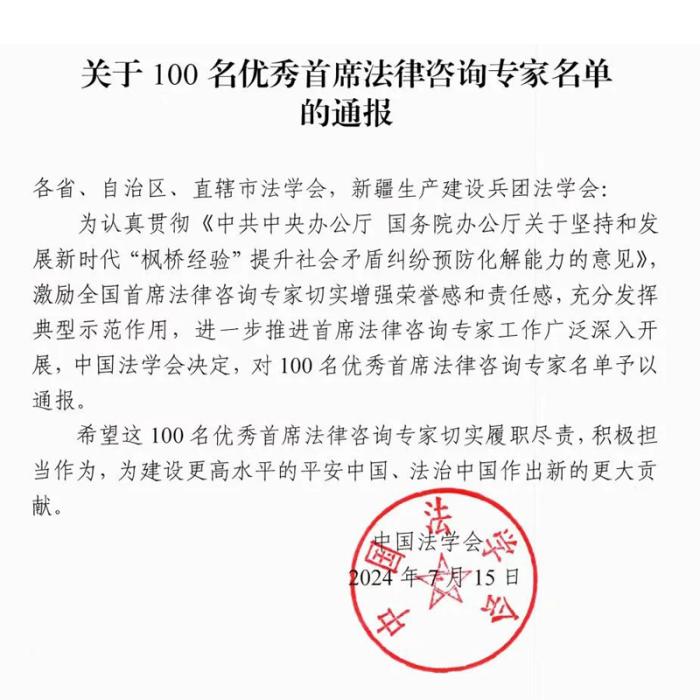 据悉,中国法学会此次通报100名全国优秀首席法律咨询专家名单,旨在激励全国首席法律咨询专家切实增强荣誉感和责任感,充分发挥典型示范作用,进一步推进首席法律咨询专家工作广泛深入开展。