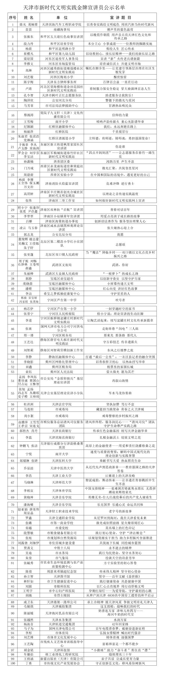 由市委宣传部、市文明办主办,津云新媒体集团承办的天津市新时代文明实践宣讲员风采展示活动圆满落幕。为确保评选工作专业权威,活动特邀高校马克思主义学院专家、资深媒体人和基层群众代表组成评审组,从内容思想性、表达感染力、形式创新性等多个维度进行综合评价。现将本次大赛评审结果予以公示。