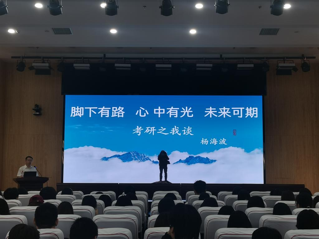 杨海波结合自身求学历程,从“认识考研”“目标确立”“科学备考”“关键要素”四个方面展开讲解,鼓励学生结合自身特点制定个性化备考方案并提出了院校选择策略、高效复习方法,帮助学生厘清备考思路、做好备考准备。他最后强调,稳定的心态、锲而不舍的精神和学习他人经验是考研成功的关键因素。