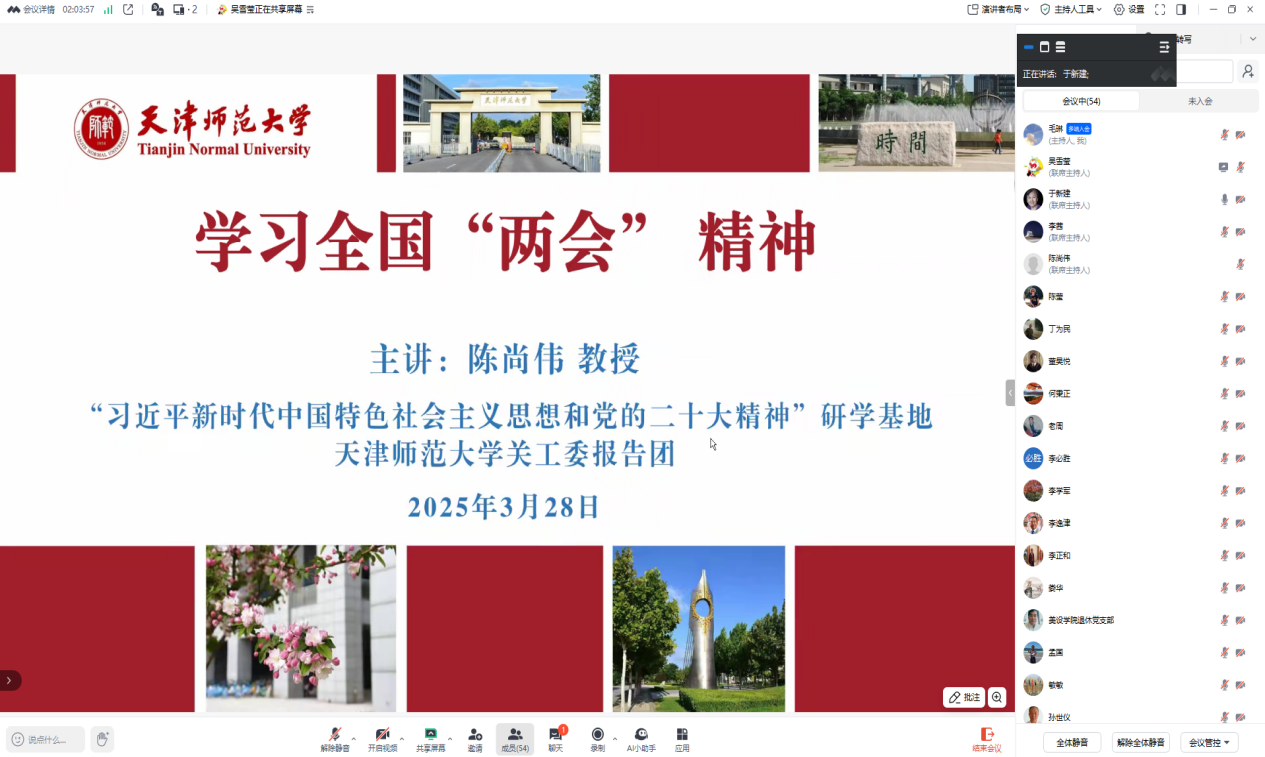 本站讯(通讯员董昊悦)为深入学习宣传全国两会精神,引导广大离退休干部进一步统一思想、凝聚共识,近日,党委离退休工作部召开专题报告会,邀请“习近平新时代中国特色社会主义思想和党的二十大精神”研学基地、贝博关工委报告团成员、马克思主义学院陈尚伟教授以“学习全国两会精神”为主题带领大家进行集体学习。贝博离退休老干部、关工委成员、离退休教职工党支部书记、部分离退休党员和党委离退休工作部全体行政干部共50余人线上参加集体学习。会议由校关工委常务副主任于新建主持。